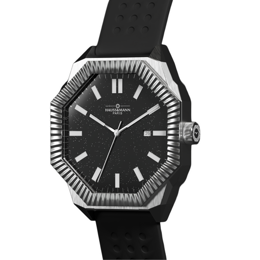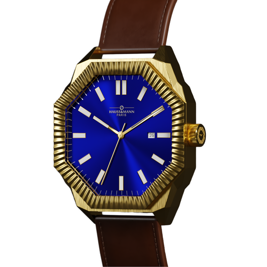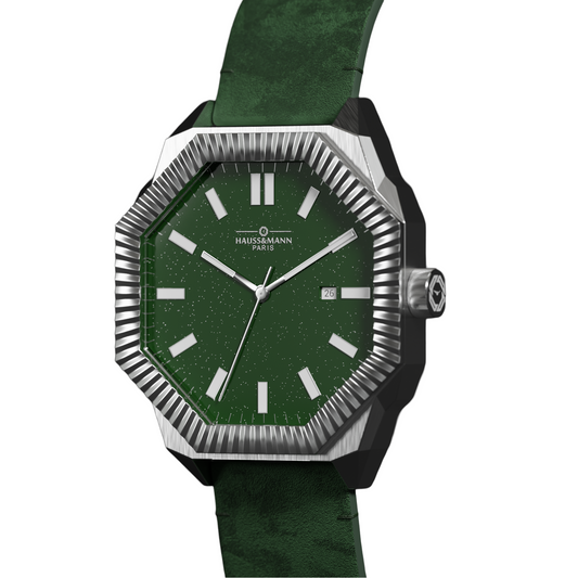Inspirée par l'élégance haussmannienne, notre nouvelle montre rend hommage à l'artisanat français. Son design audacieux, mêlant lignes droites et courbes voluptueuses, évoque les façades parisiennes. Avec son boîtier octogonal en acier inoxydable et son cadran en aventurine, elle allie robustesse et raffinement. Dotée d'un mouvement mécanique japonais précis, elle vibre au rythme de la Ville Lumière.